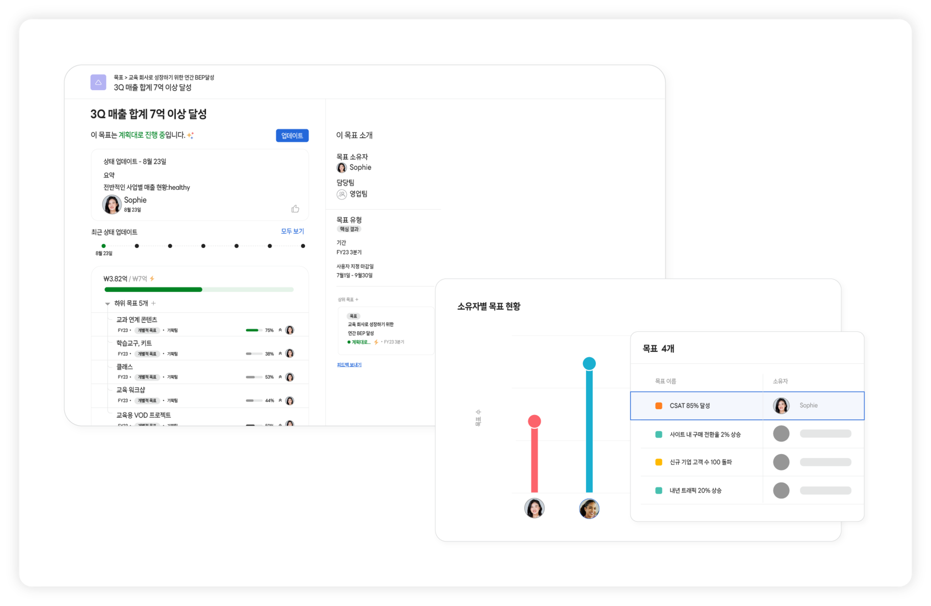 조직 목표 설정팀 목표 연계진행률 자동 계산목표 달성 현황 리포트