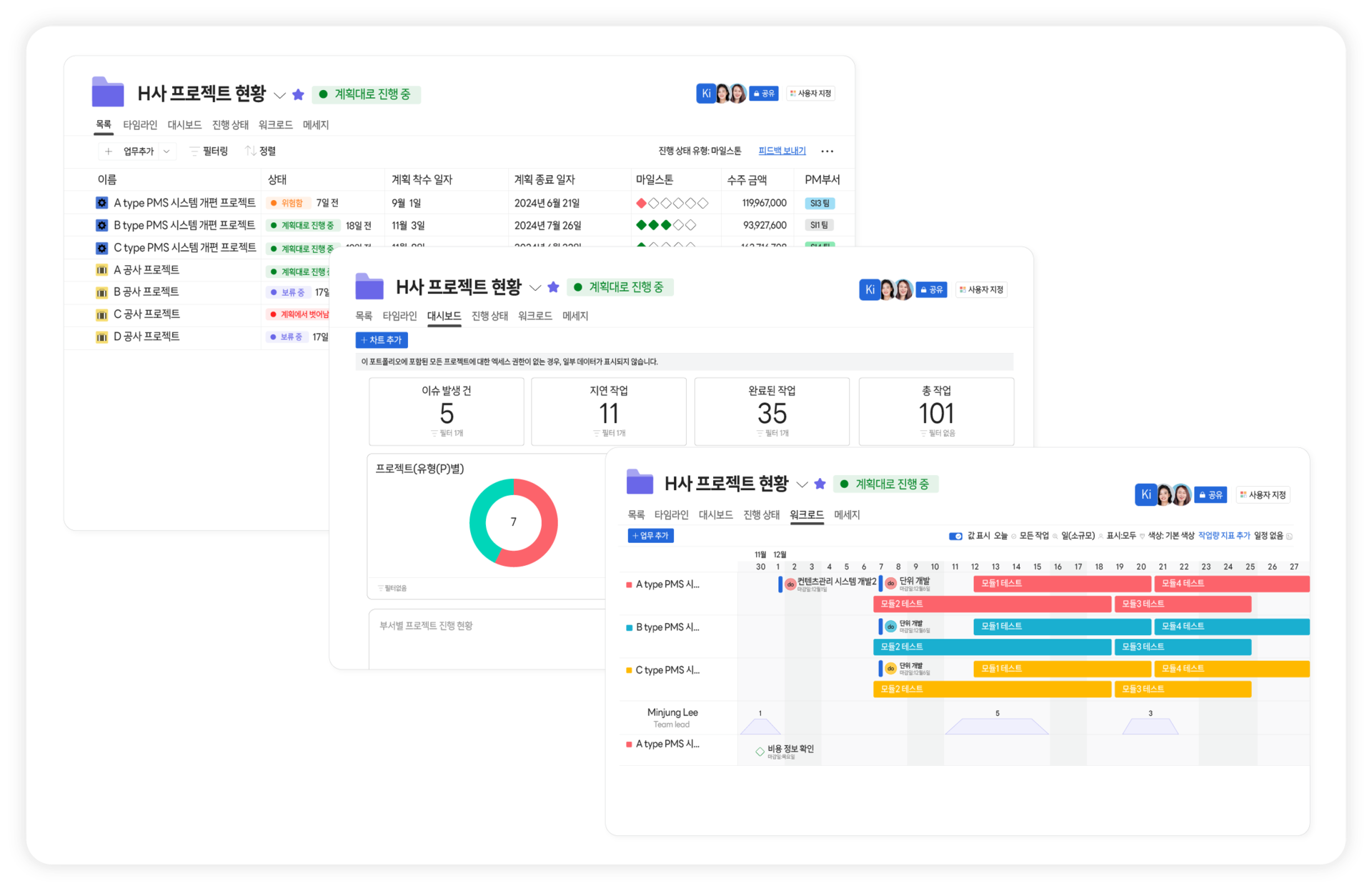 여러 프로젝트의 진행 상황을 한눈에 파악하고 관리하세요. 부서별, 팀별 프로젝트를 통합 관리할 수 있습니다.